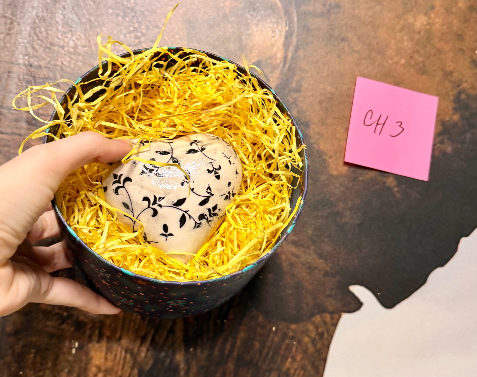 Ručně vyráběné keramické výrobky po přežahu i ostrém výpalu glazury, balené do dekorativních a luxusnějších obalů. Použité balicí materiály: umělé seno. Na fotografiích je vidět poměr velikosti k ruce i způsob balení. Tapeta na pozadí není součástí produktu.