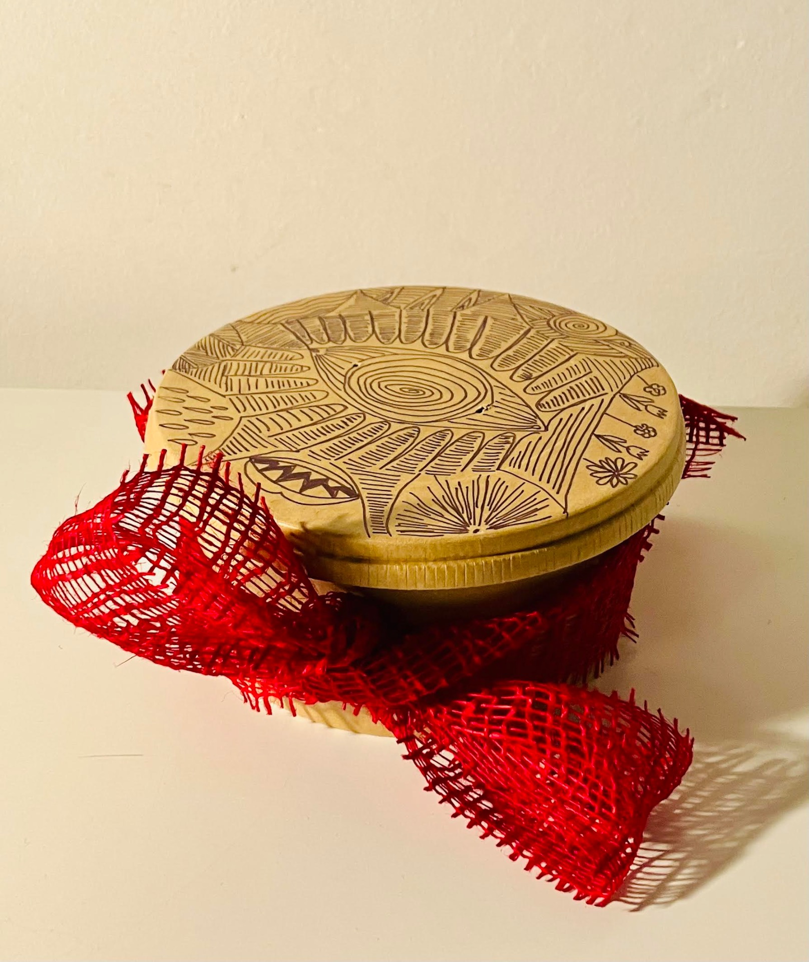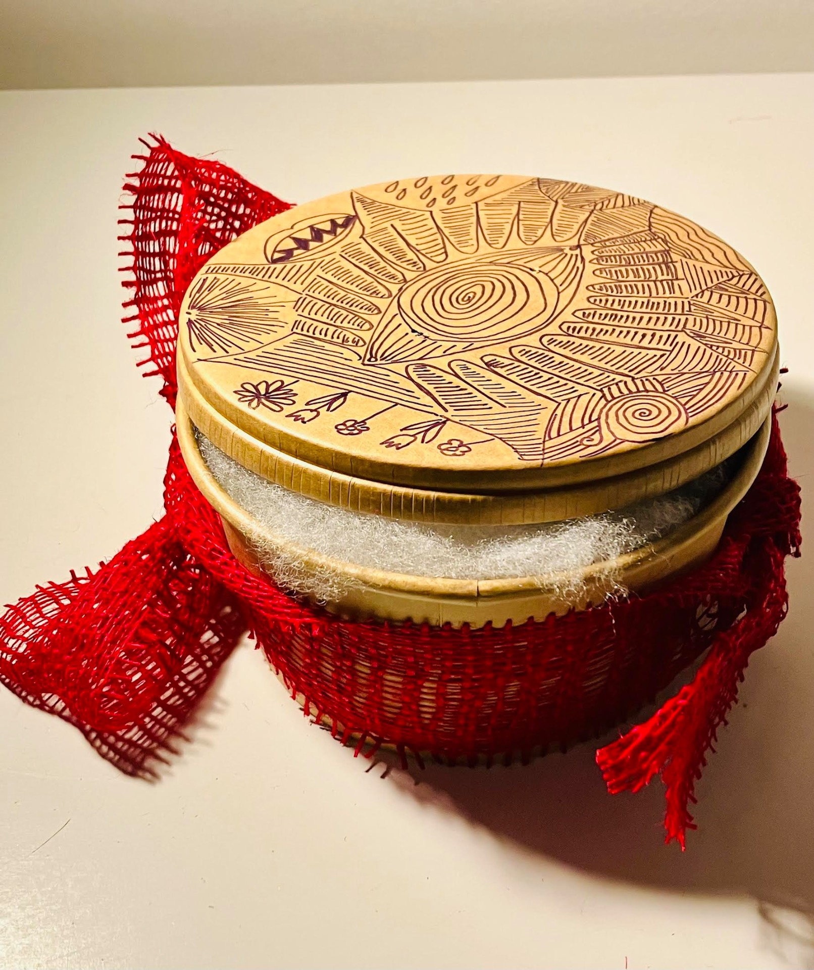 Víko krabičky je ručně pokreslené. Mašle je ručně aranžovaná a dodává celému balení jedinečný vzhled.
