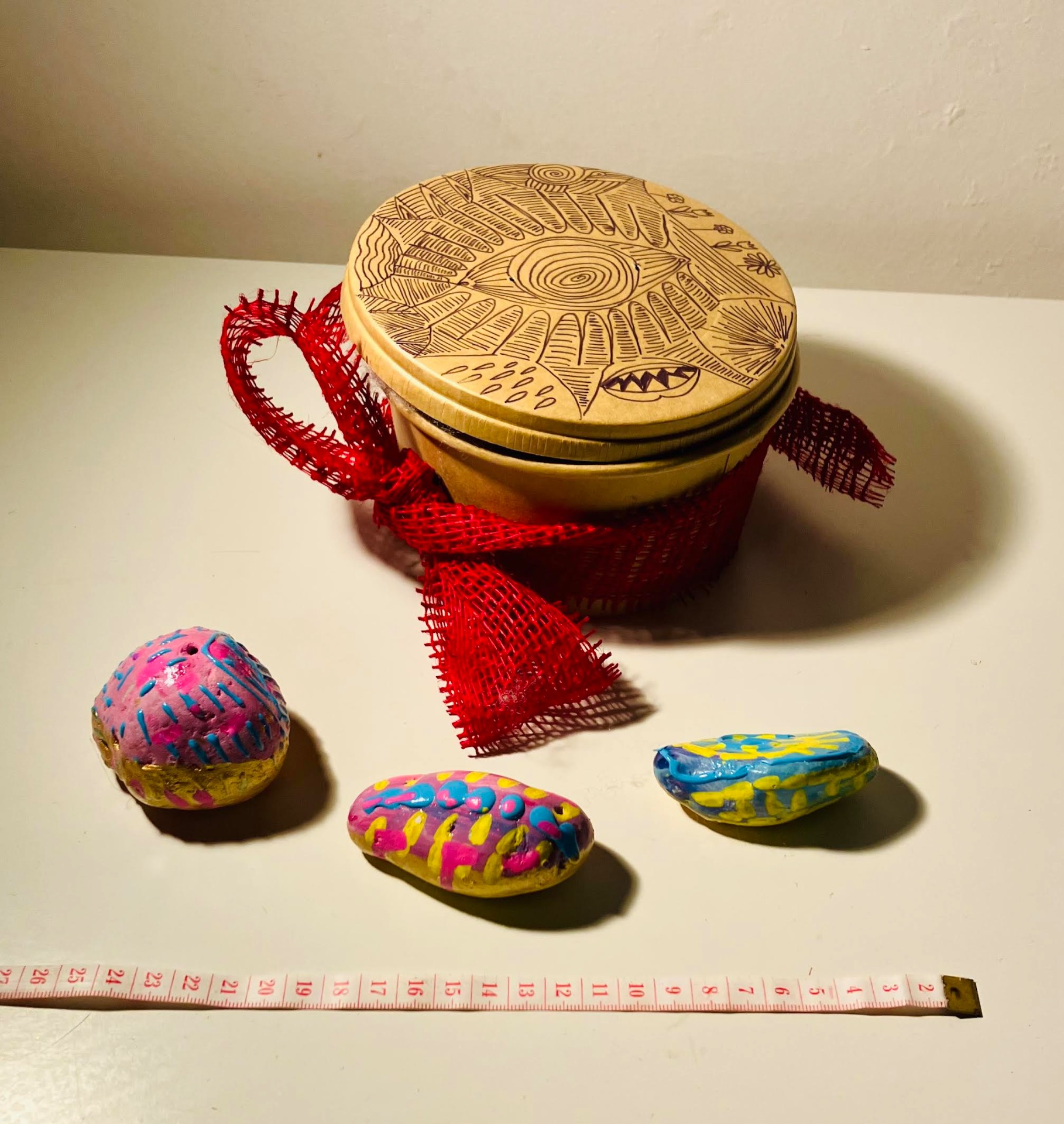 Ručně malované a lakované kamínky zabalené v originální dárkové krabičce s ručně malovaným víkem a ručně vyráběnou mašlí. Každý kus je jedinečný.