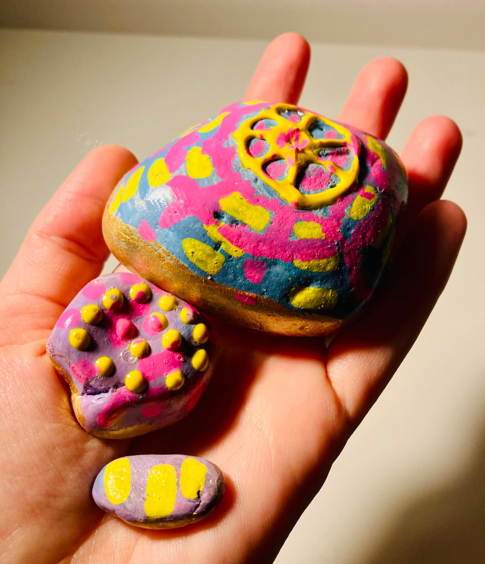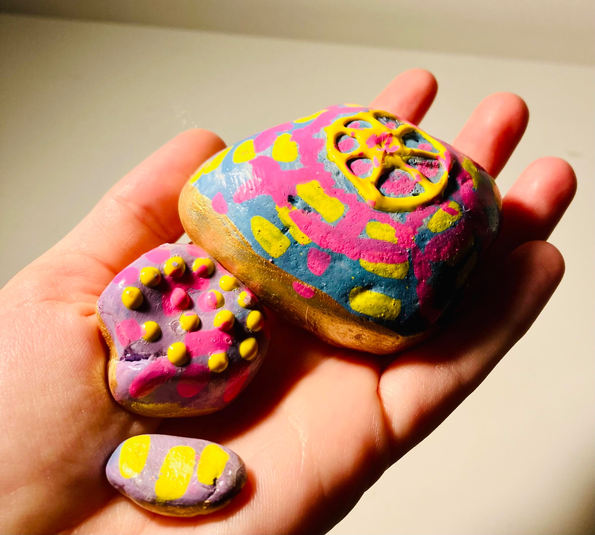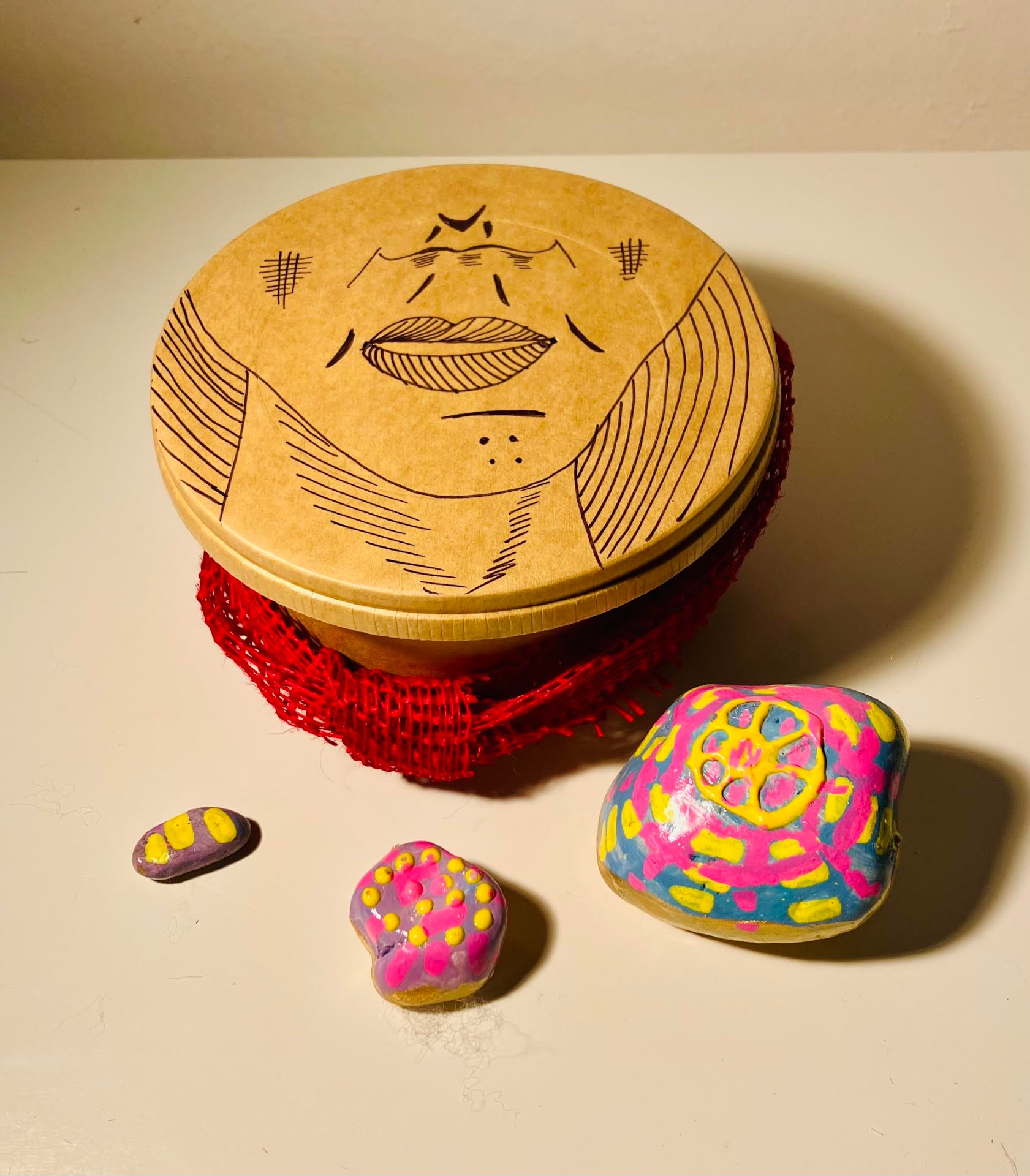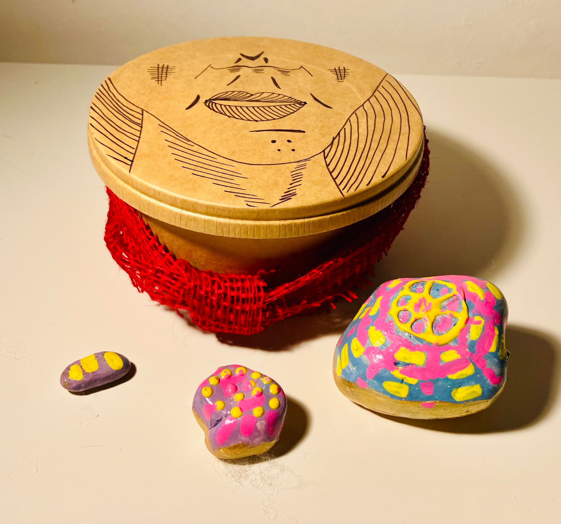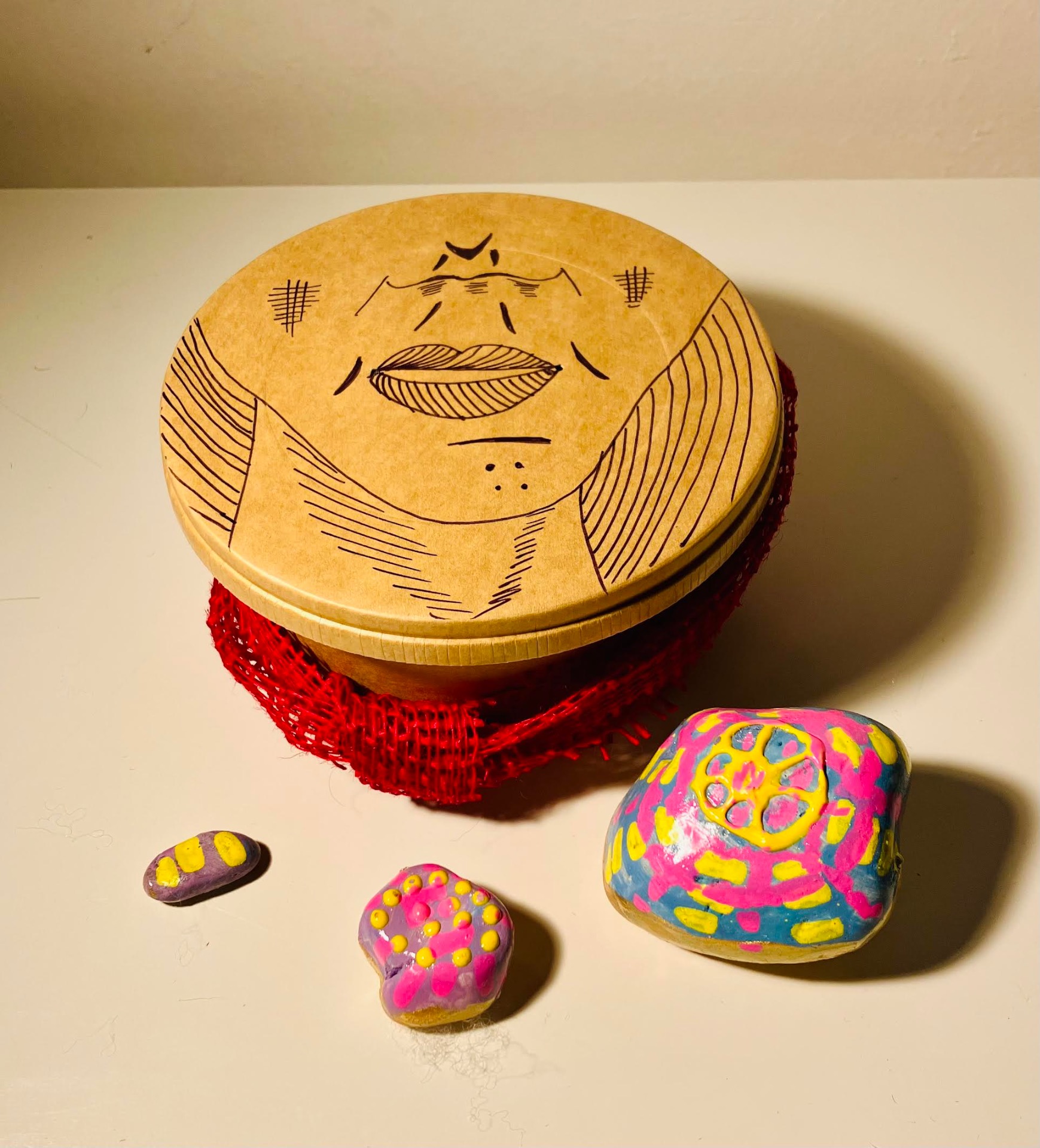 Ručně malované umělecké kamínky v lakované úpravě, uložené v dárkové krabičce s ručně malovaným víkem a ozdobnou mašlí.