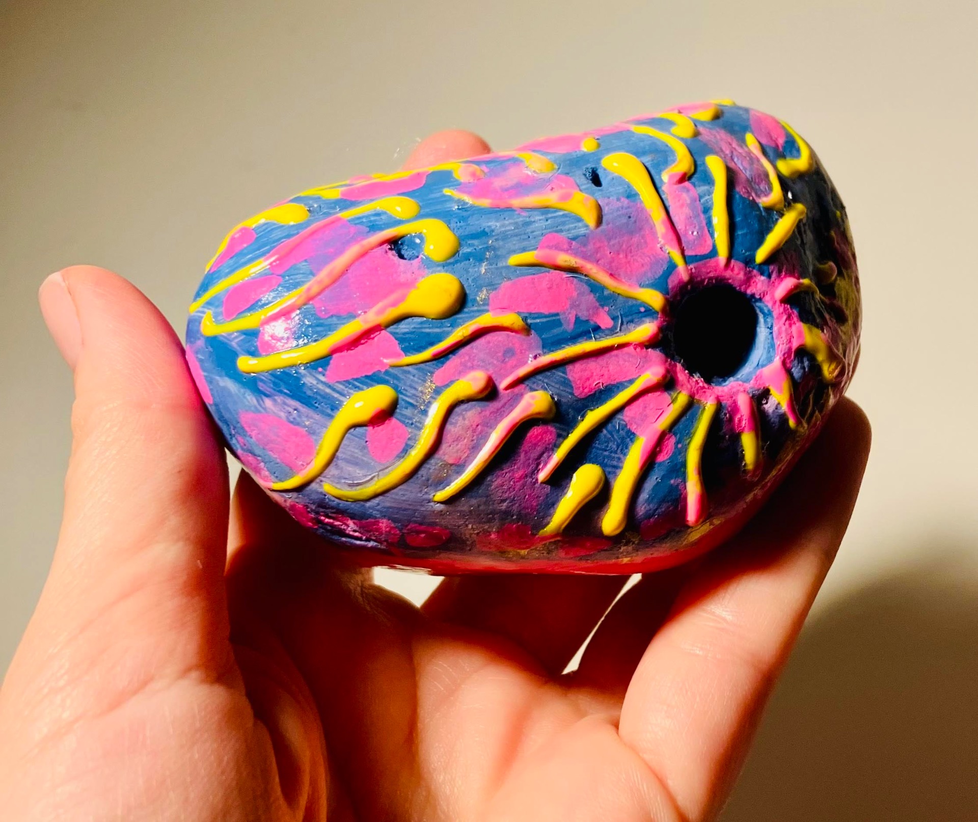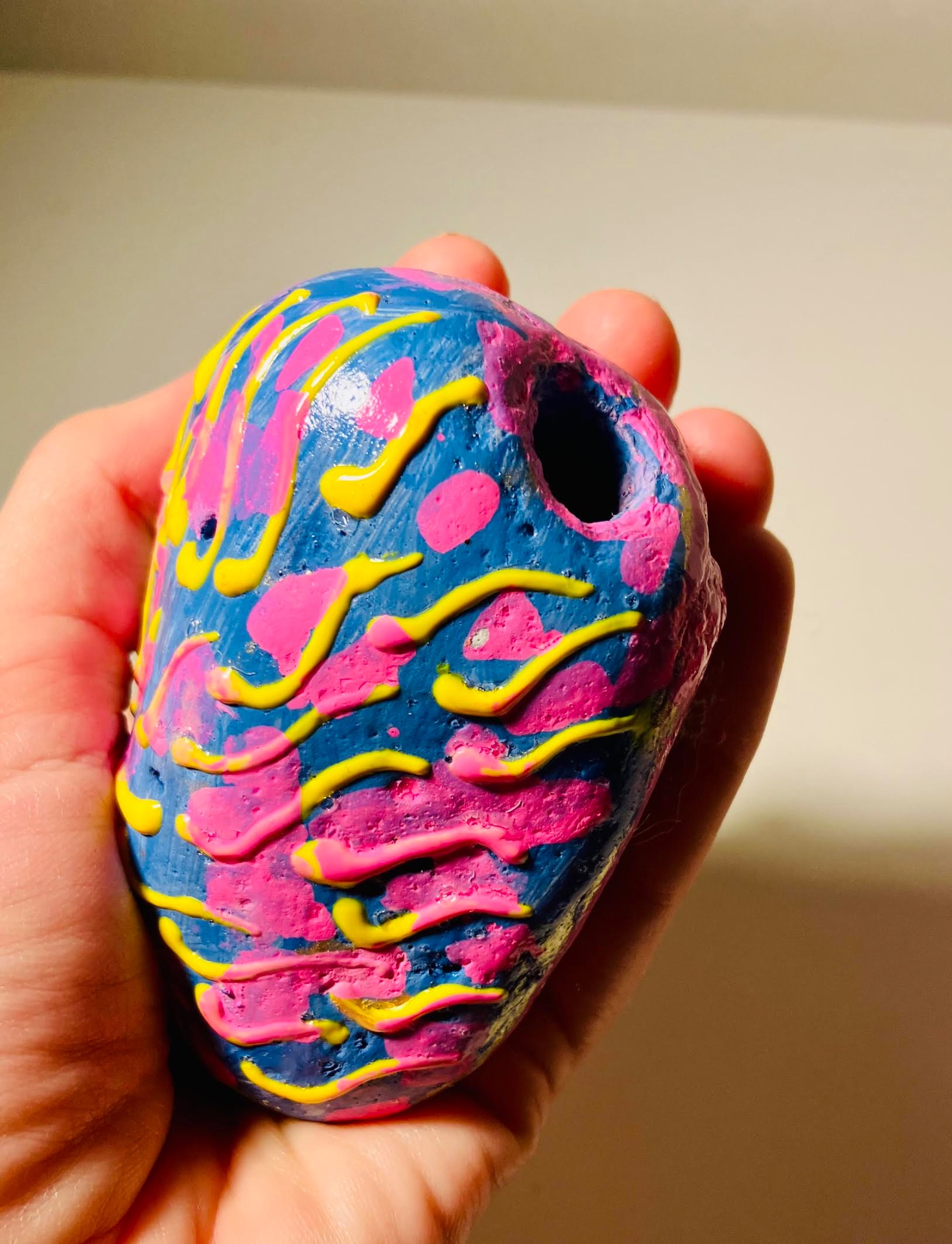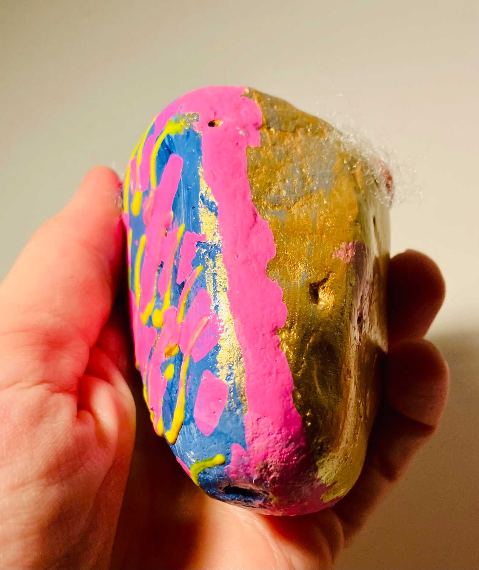 Tento velký ručně malovaný kamínek je jedinečný svým provedením, velikostí a praktičností. Kromě originálního ručního malování je kamínek doplněn o dvě průchozí díry, které mohou sloužit jako neobvyklý a stylový stojánek na tužky, štětce, sušené květiny, dekorace nebo jen jako unikátní designový prvek.