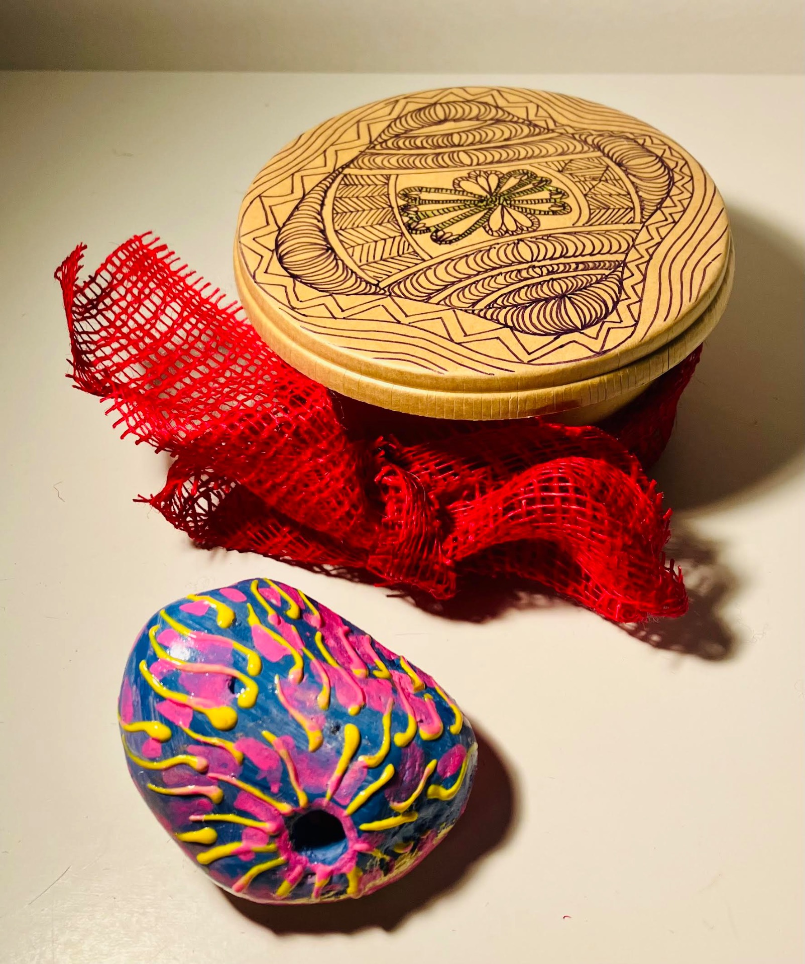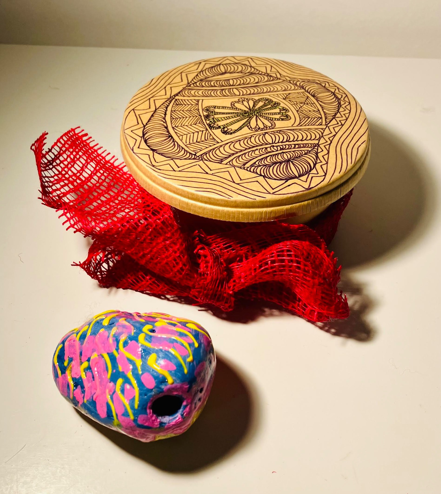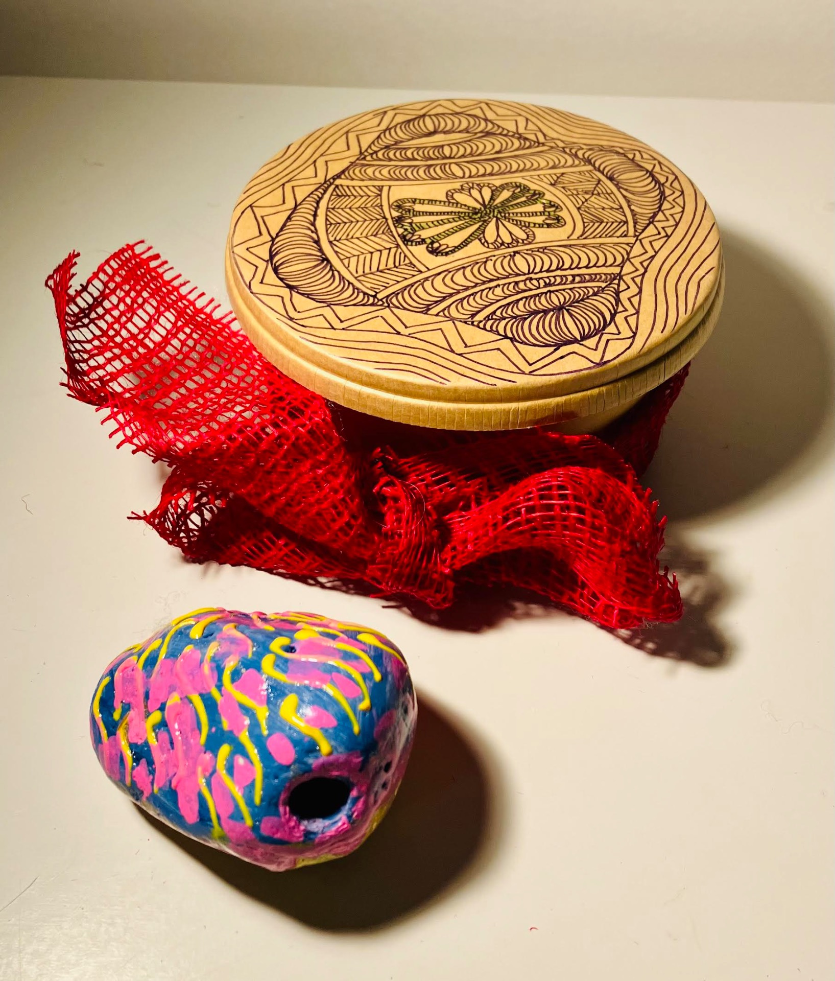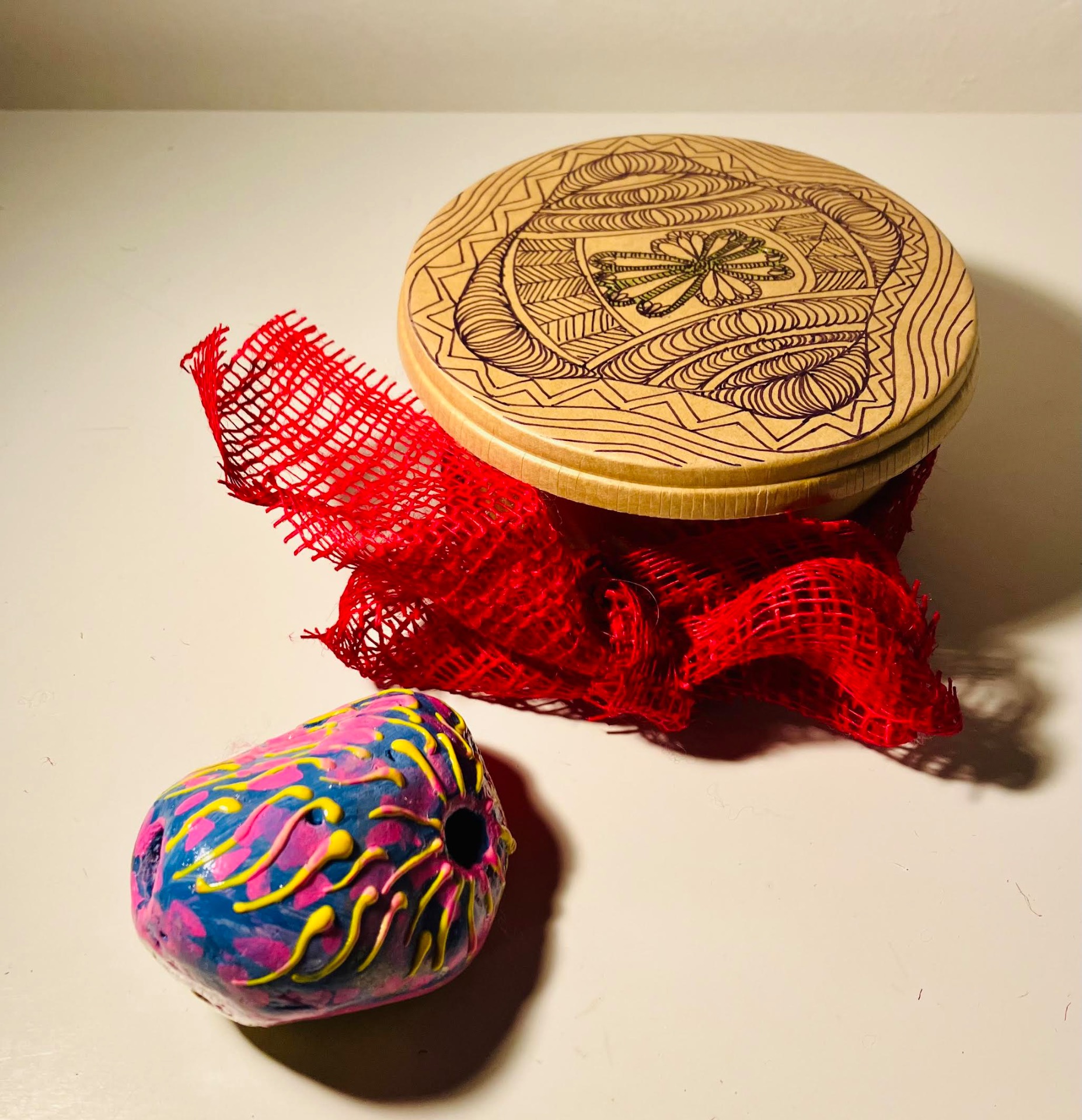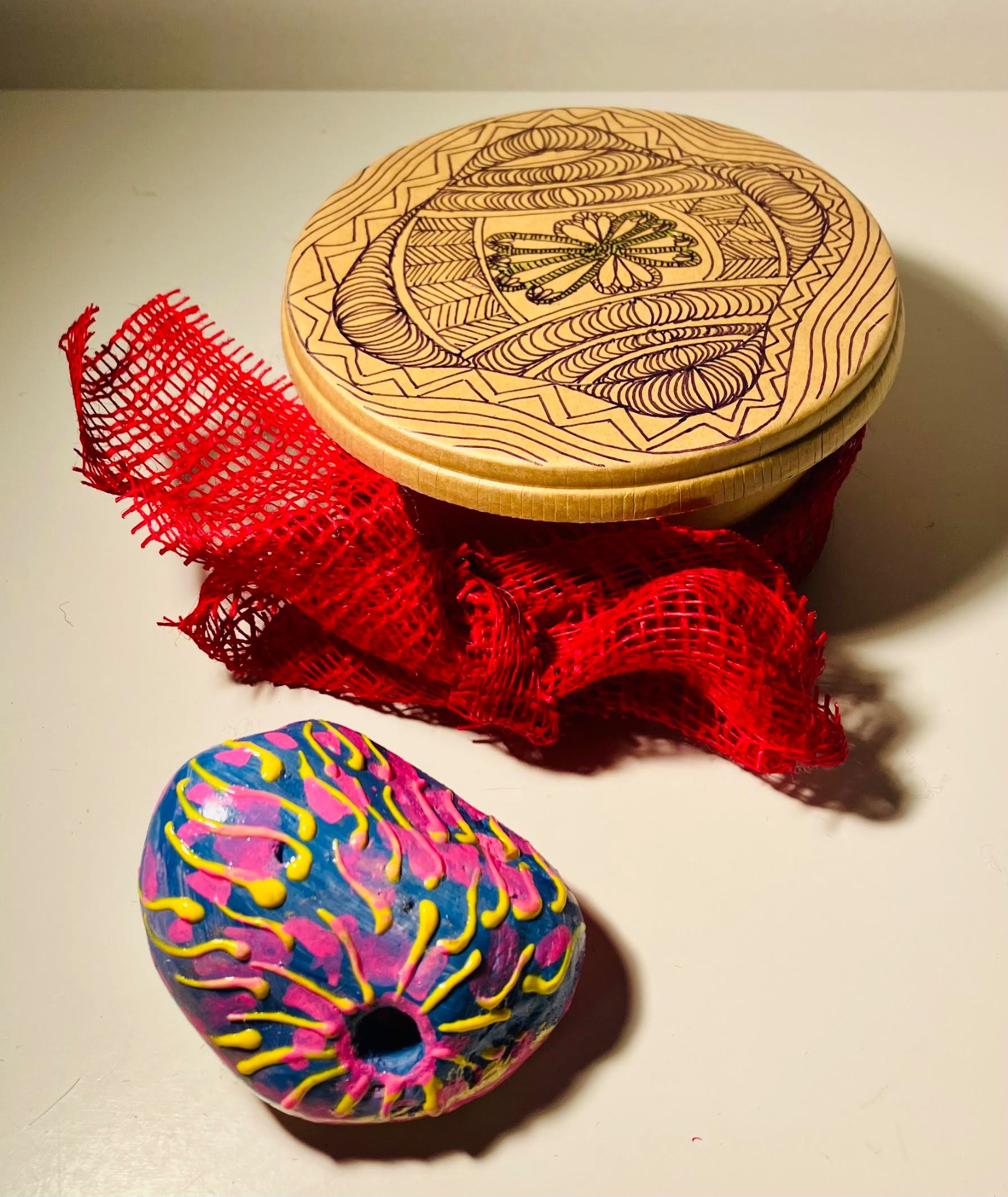 Velký ručně malovaný kamínek s dvěma praktickými otvory, které lze použít například na tužky, štětce nebo dekorace. Ručně malované víko krabičky + originální ruční mašle.